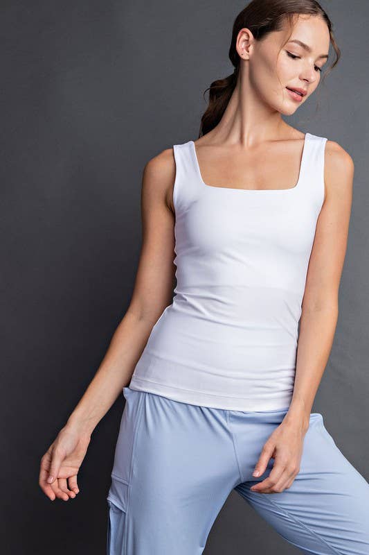 This playful tank top features buttery-soft fabric, a sleeveless design, and a charming square neckline for a fresh, fun look.