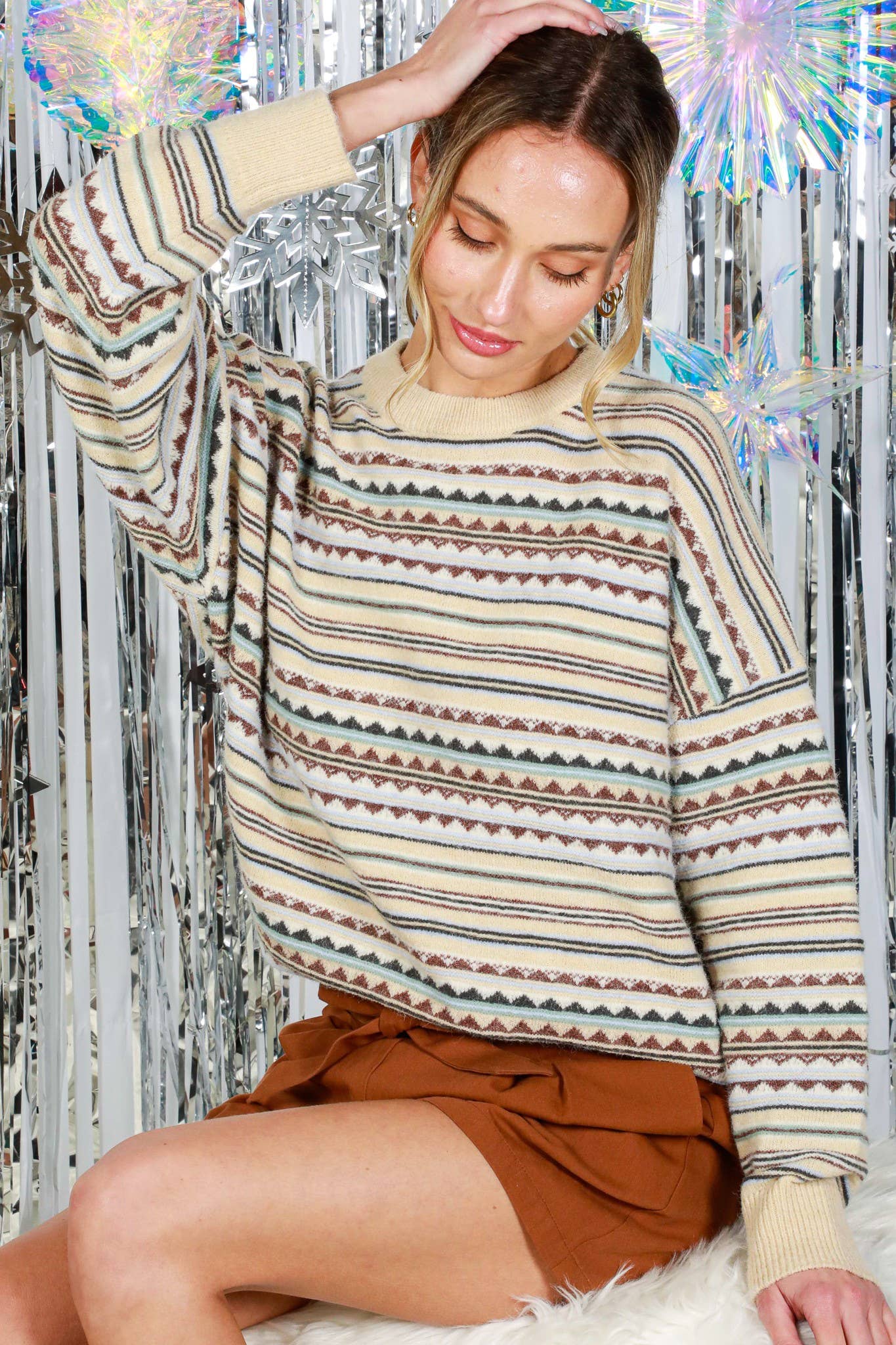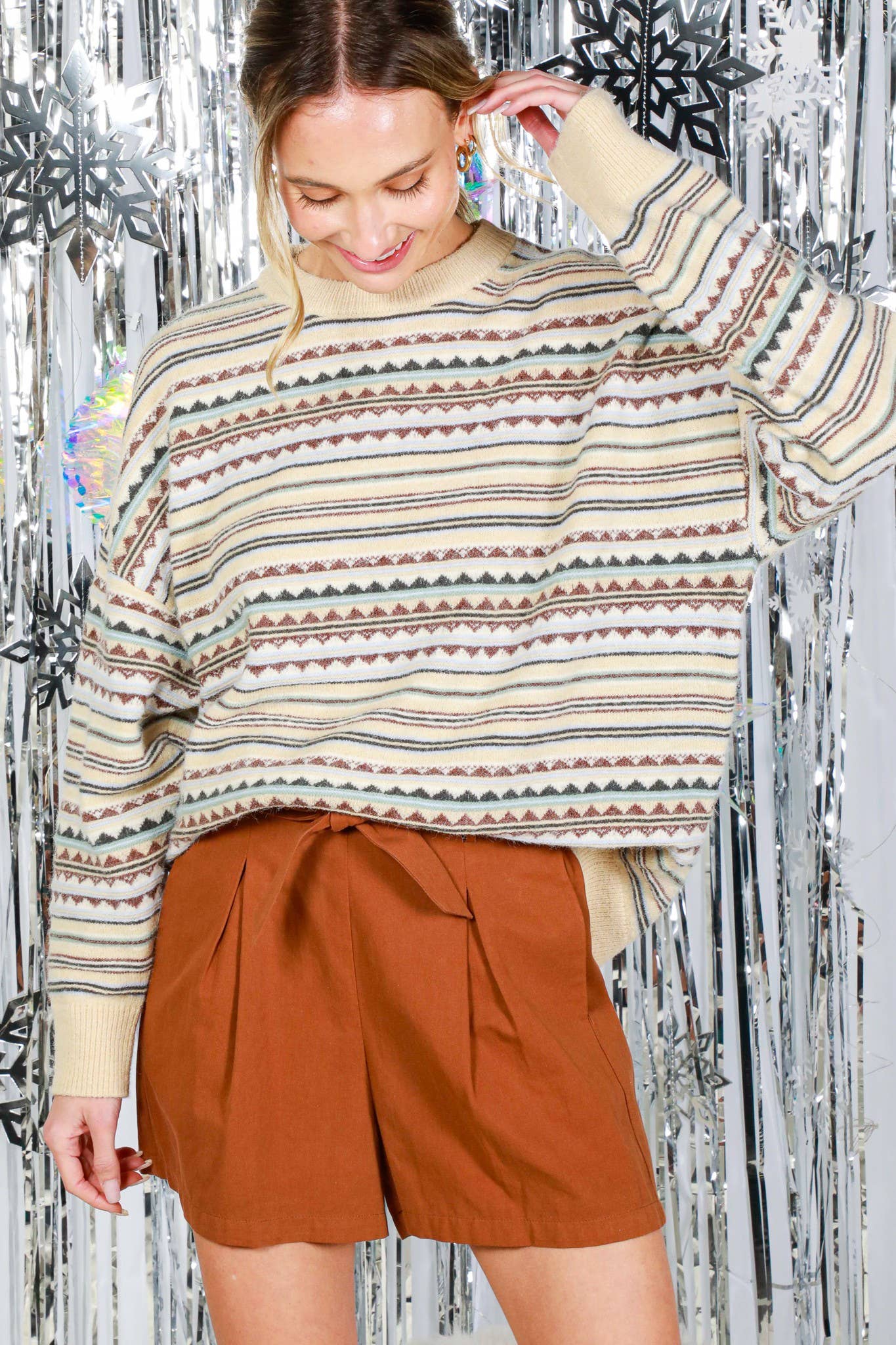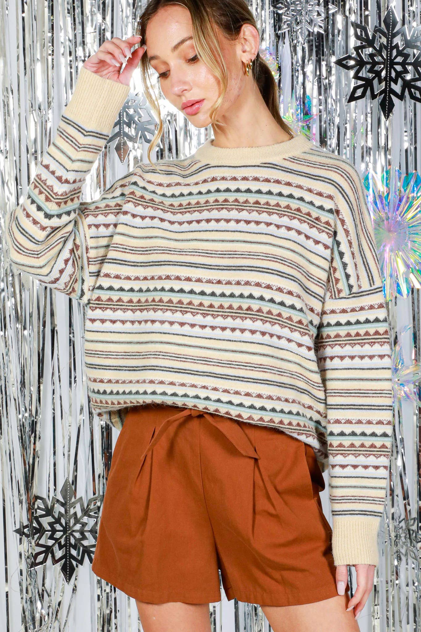 This cozy pullover features a ribbed crew neck and playful multi-striped design. With its laid-back drop shoulder and ribbed cuffs, it’s perfect for everyday fun, work, or chilly fall and winter days. Soft to the touch and bursting with color, this long-sleeve sweater brings a cheerful vibe to any outfit.