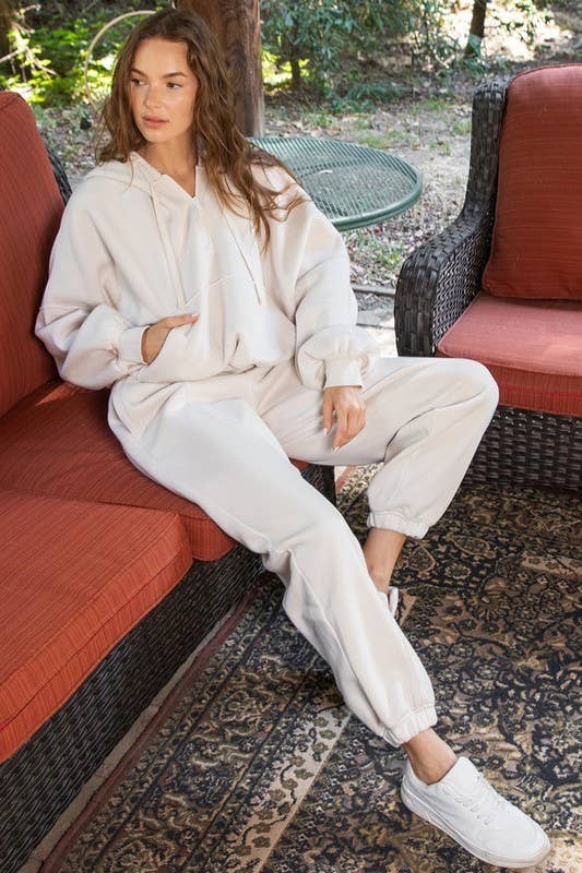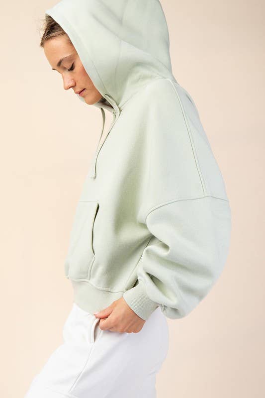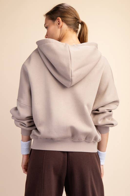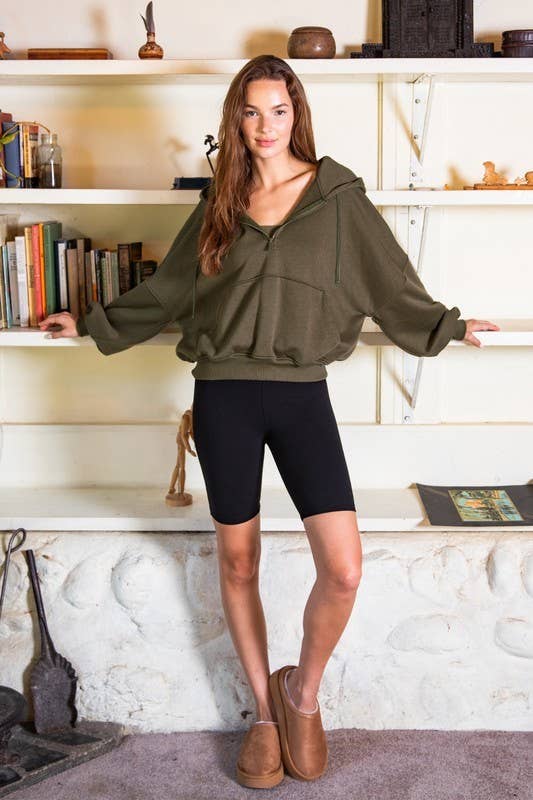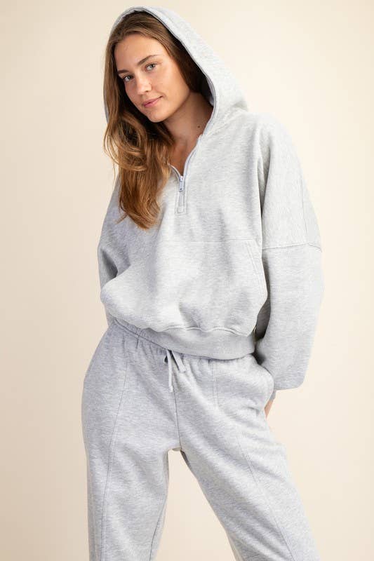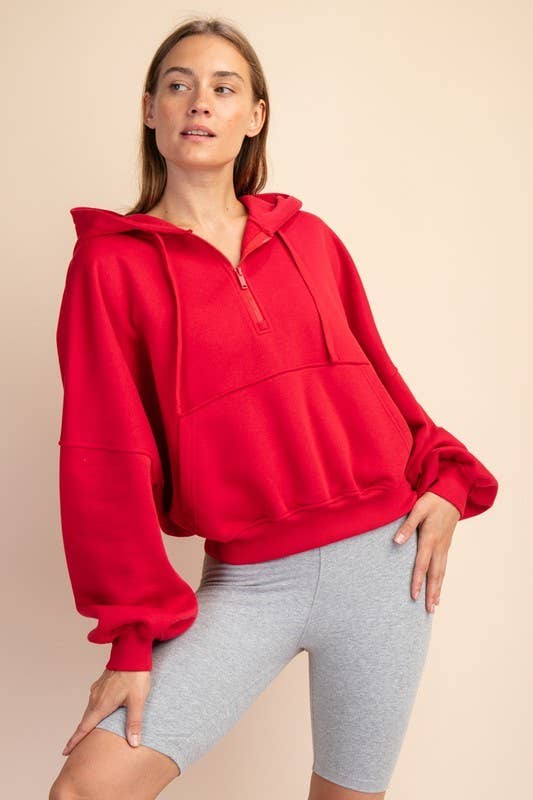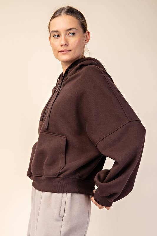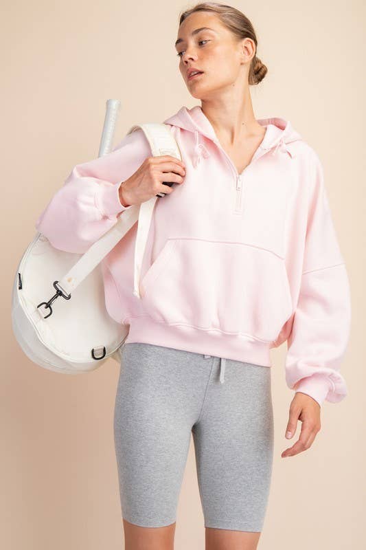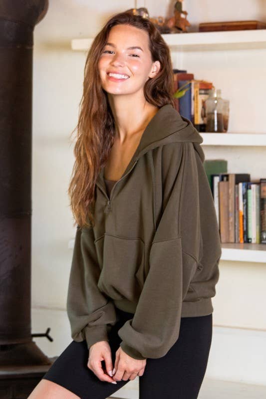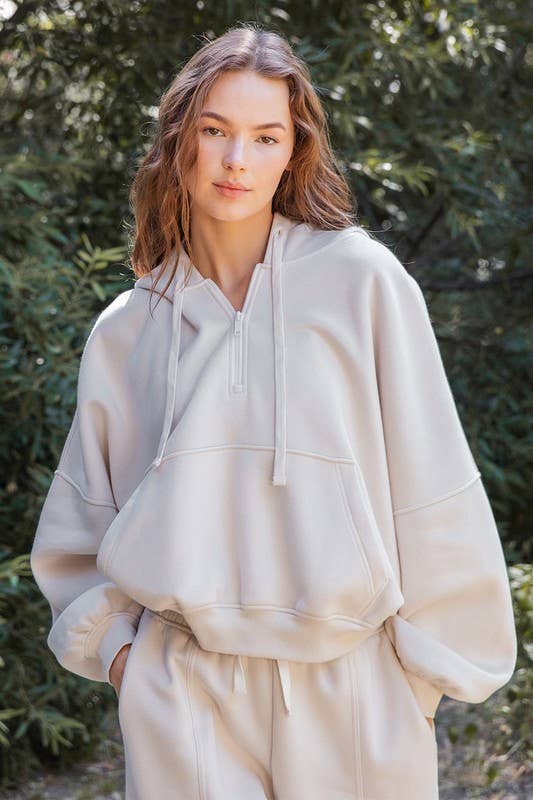 Experience cozy comfort with this quarter-zip hoodie crafted from soft French terry fabric featuring a brushed interior. Its relaxed, oversized bubble shape and ribbed cuffs make it perfect for lounging, while the kangaroo pocket and drawstring hood add playful practicality.