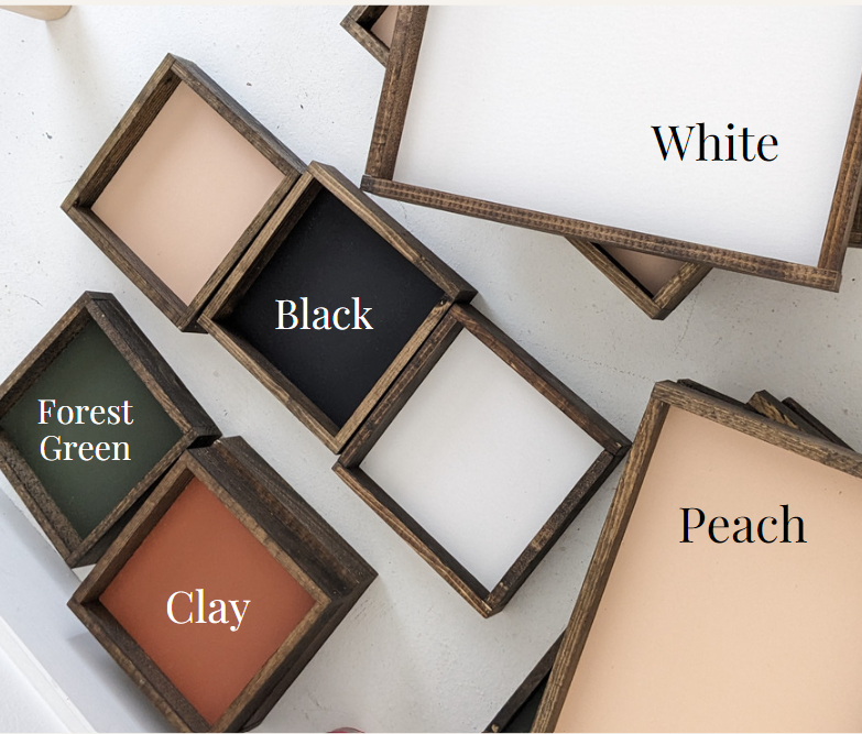 All of our signs are made with 1/2” MDF backing with 5” x 2” stained pine wood frame. We use acrylic paint on all of our products. We create all of our items with a process called silk screening.