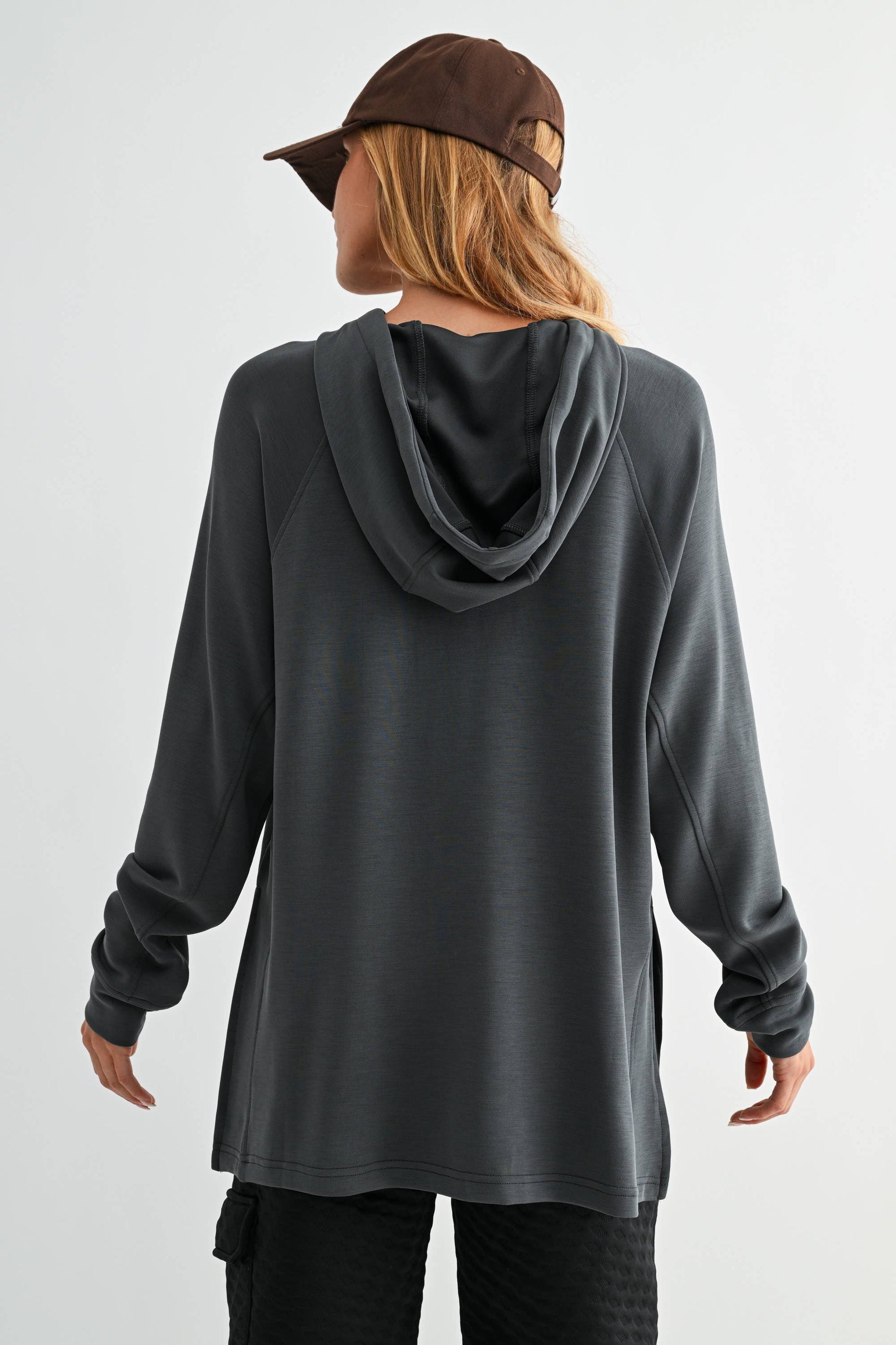 Meet your new go-to hoodie: the Laguna Dune. Crafted from our signature sand-washed scuba fabric, it’s irresistibly soft and delightfully plush. This pullover sports a relaxed mock neck with adjustable drawstrings, comfy raglan sleeves, and a flattering longline cut with cheeky side slits and a subtle high-low hem that moves with you. Complete with a cozy kangaroo pocket, it’s perfect for lounging after yoga, gearing up for coffee, or simply kicking back in style. Made from 47% modal, 46% polyester, and 7% spandex, and easy to care for with a delicate machine wash.
