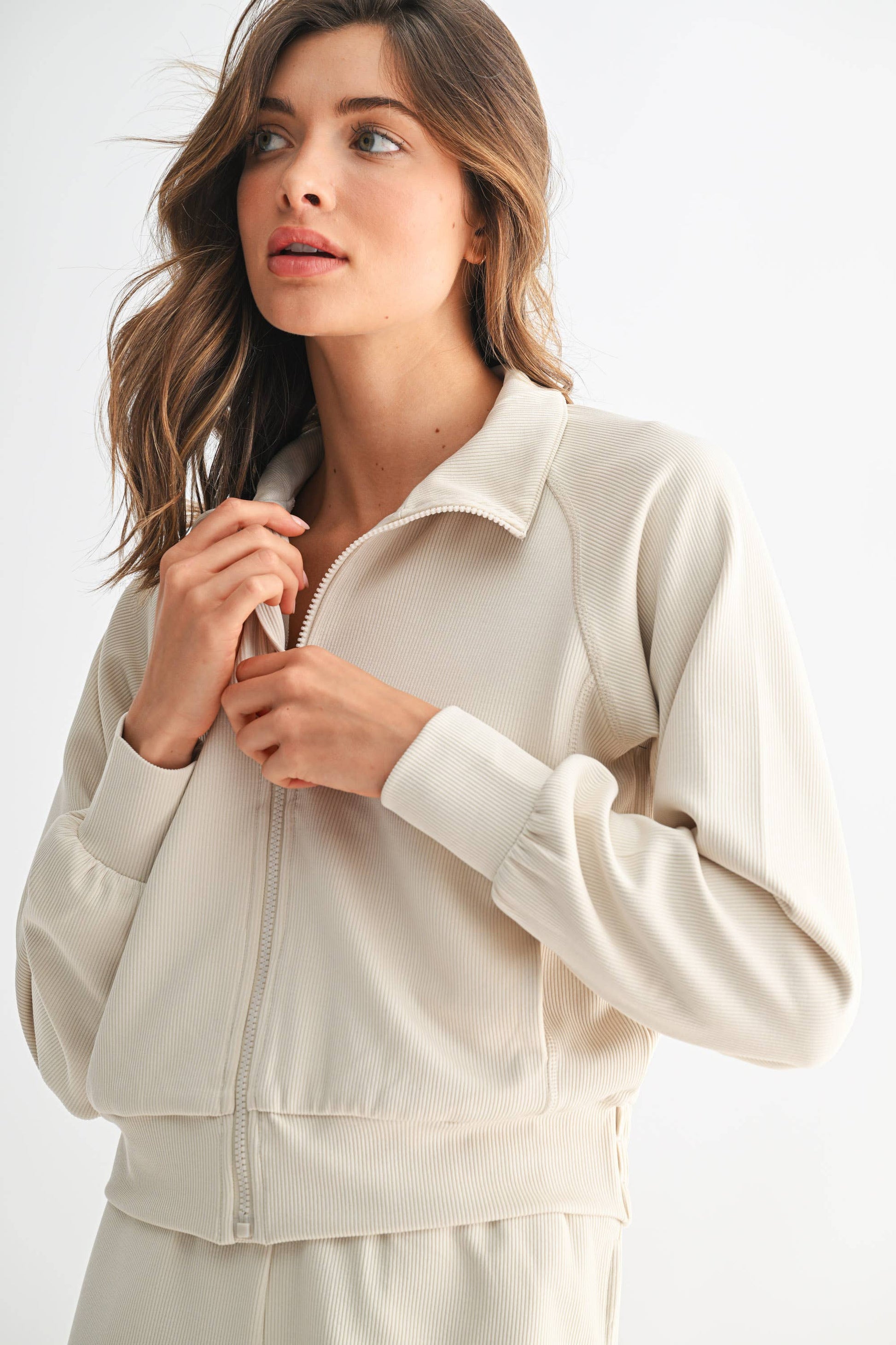 Elevated comfort meets easy structure in the Luxe Sand Wash Rib Zip Jacket. Crafted from ultra-soft, sand-washed rib fabric with a luxurious, buttery feel, this piece blends lounge-worthy texture with subtle tailoring. The mock neck and zip-up front offer clean, modern lines, while the single center back pleat adds gentle volume and movement. Finished with elastic wrist cuffs, a smocked bottom hem for a flexible fit, and practical side pockets, it’s the perfect layering piece for everyday ease and refined relaxation. 68% polyester 26% modal 6% spandex