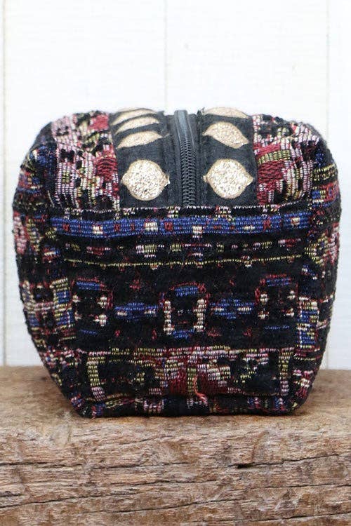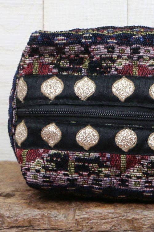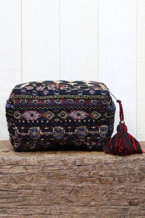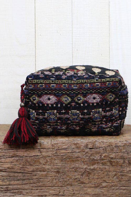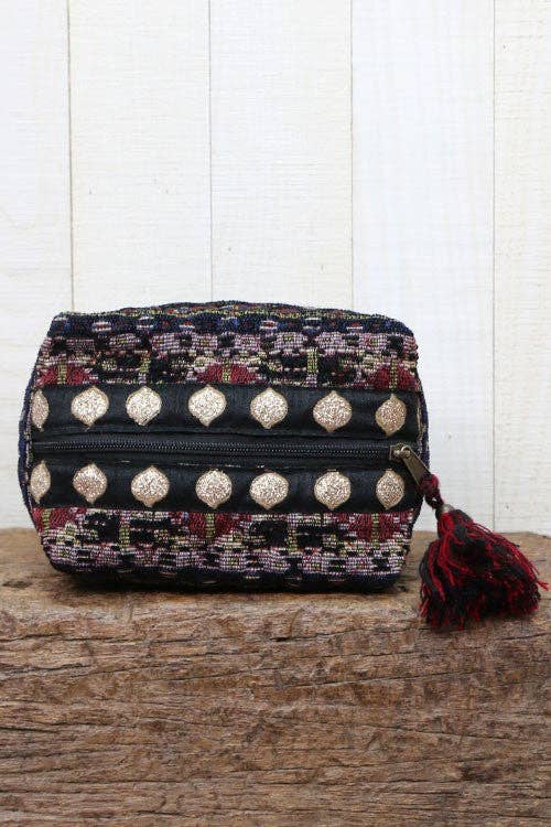 Multi jacquard stripe makeup bag with coin trim and tassel zipper pull.