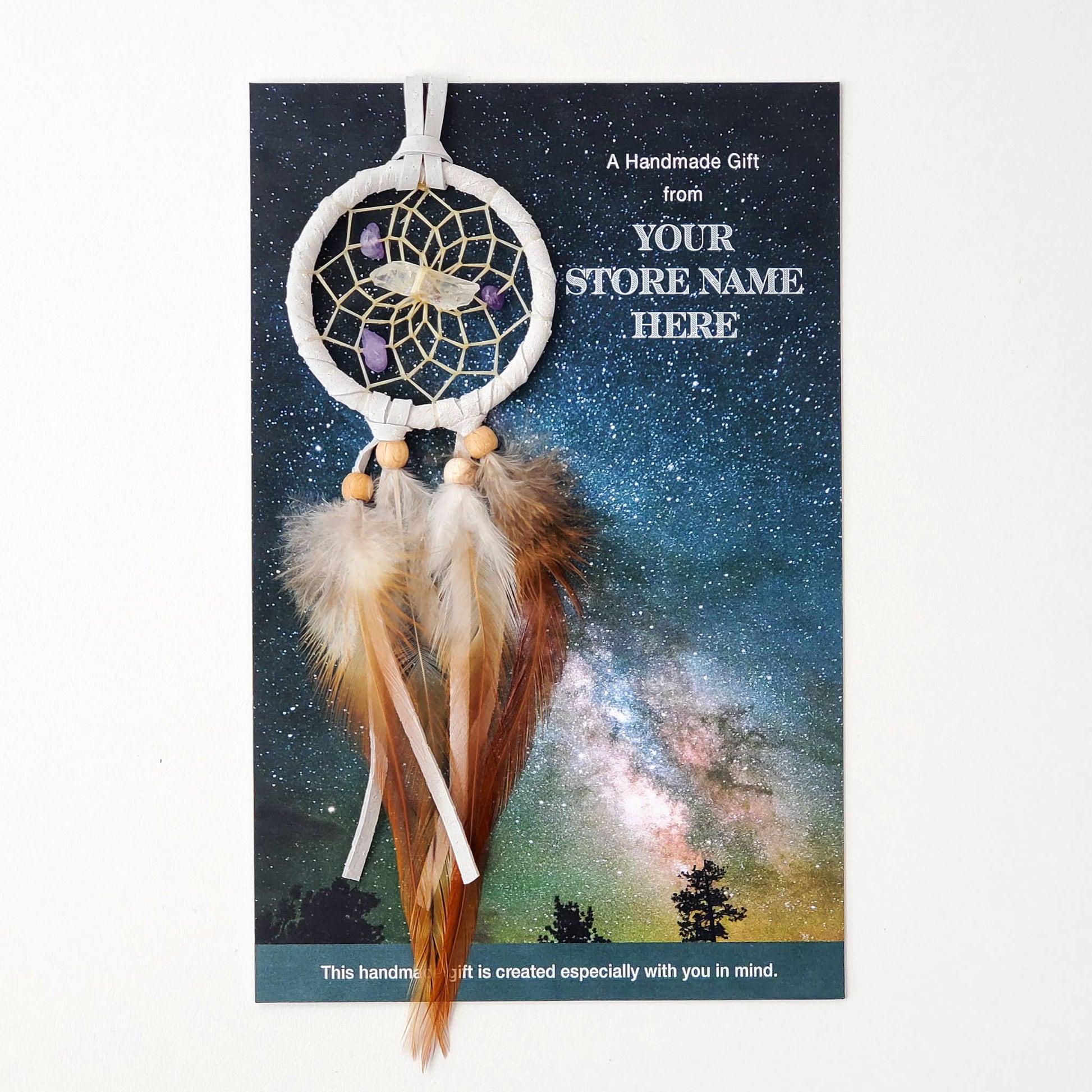 SOLD IN PACKS OF 48 CARDS • Starry Starry Night - Name Drop Ready Promotional Card • Attached with a 2" Vision Seeker Dream Catcher • On Faire Messages, send us your logo, or let us know your store name, city, or location.