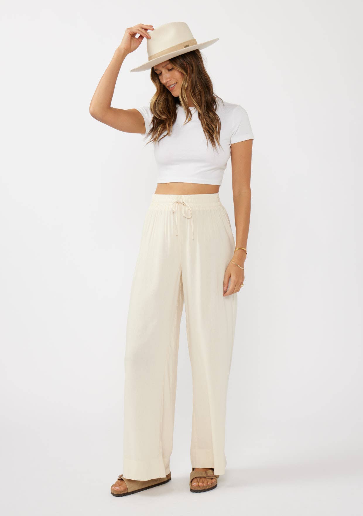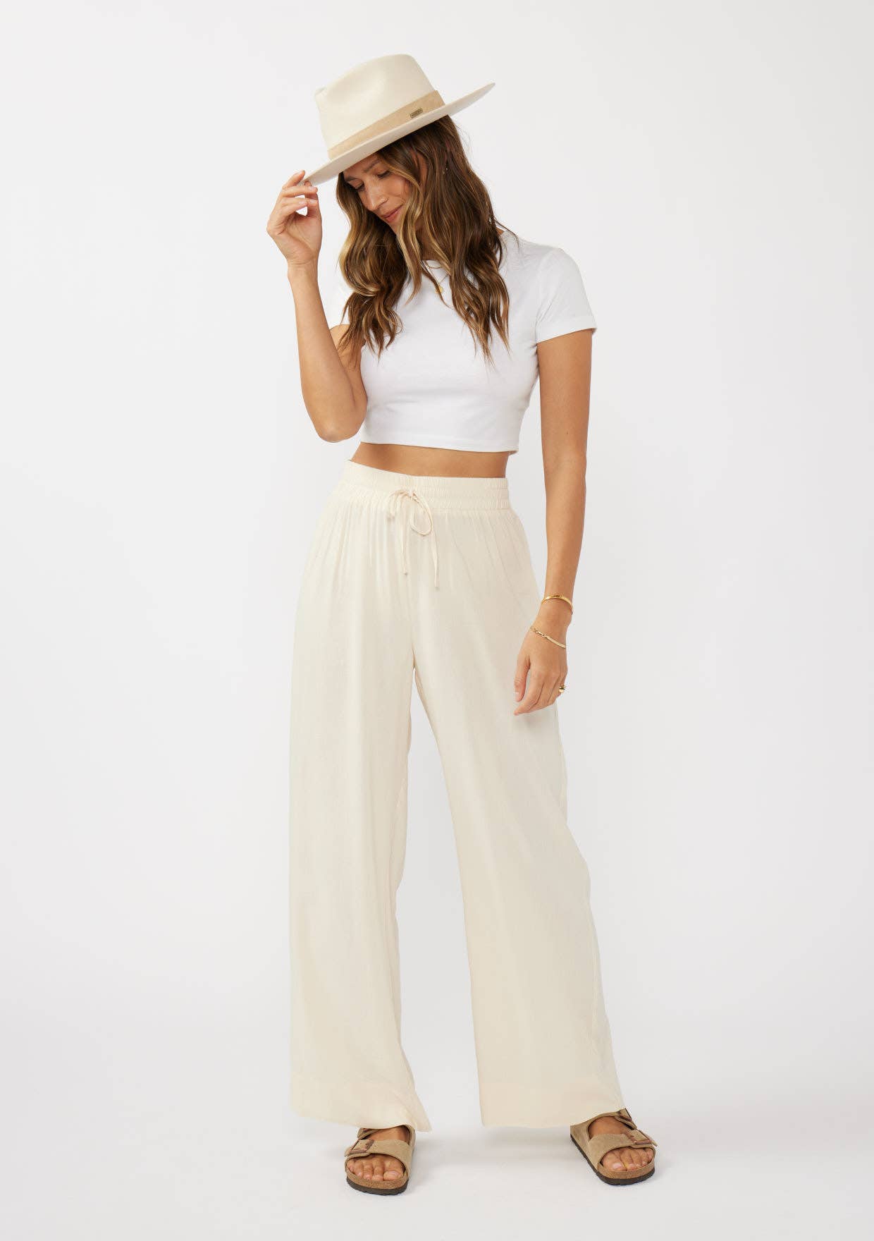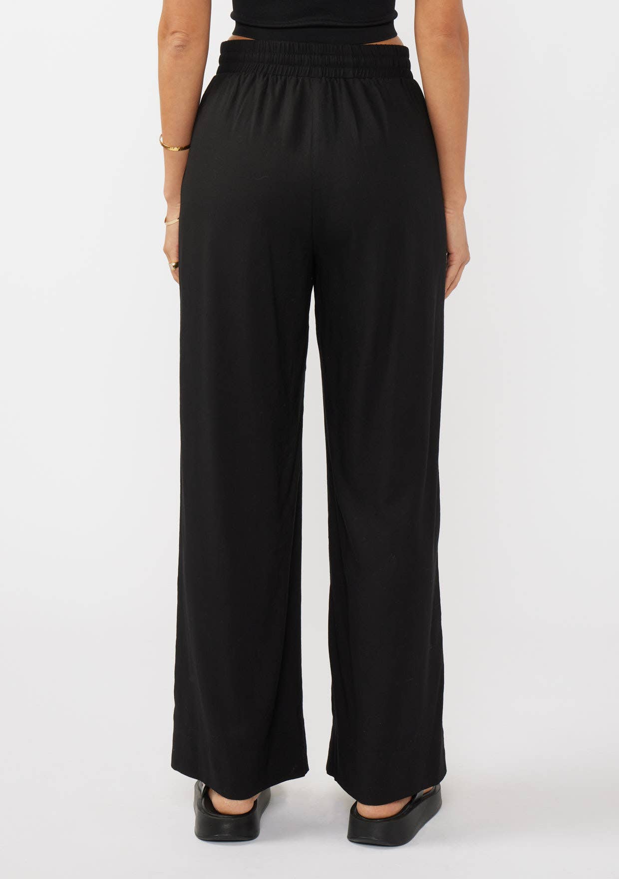 Ruffled Waist Washed Linen Cotton Wide-Leg Pants