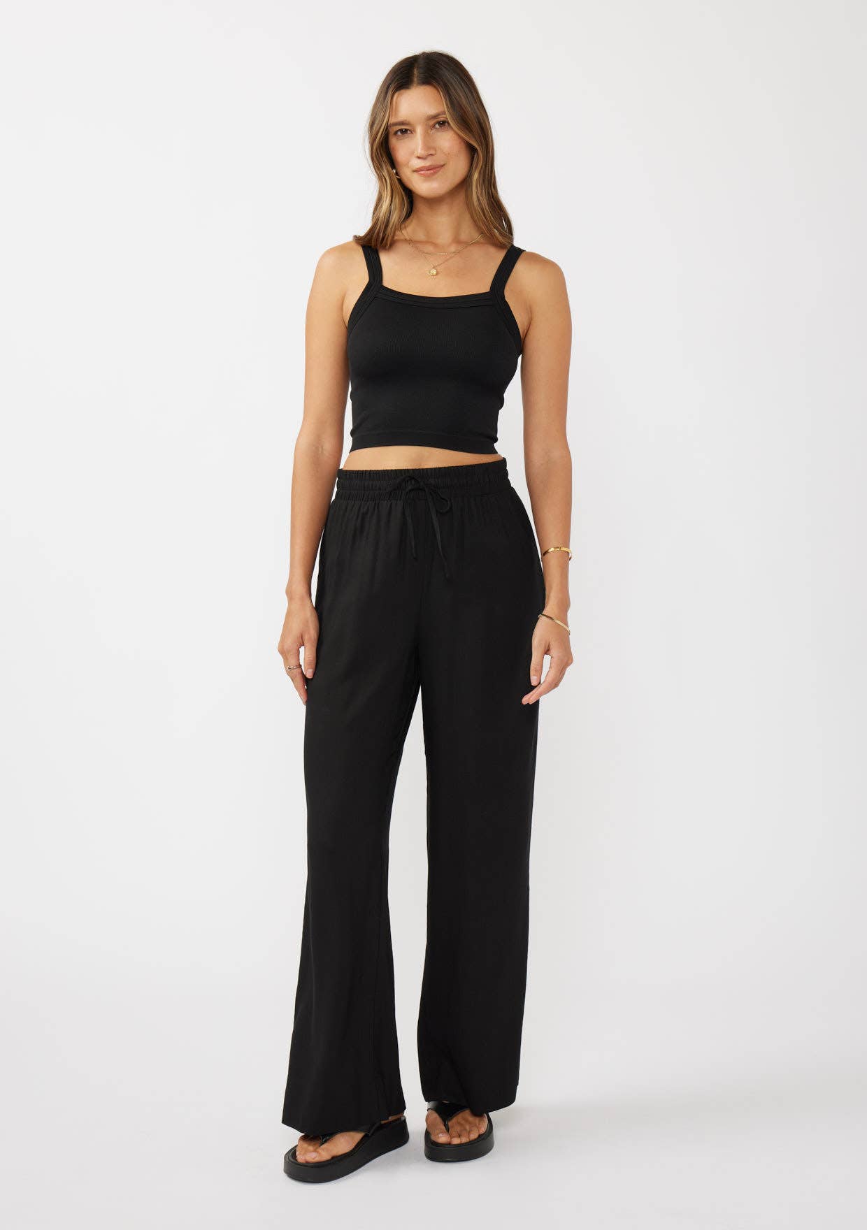 Designed for effortless comfort and style, these wide-leg pants are crafted from soft, breathable washed linen cotton. The waistband with an elastic casing and self-tie spaghetti drawstring adds a charming touch, while the relaxed straight cut and elasticized leg openings ensure an easy, flattering fit perfect for any occasion.