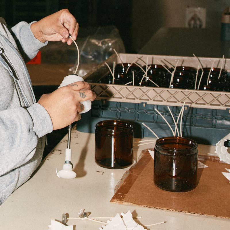 Our 12.5 oz Large Candles are hand-poured into apothecary-inspired amber jars with our signature kraft label and a brass lid.